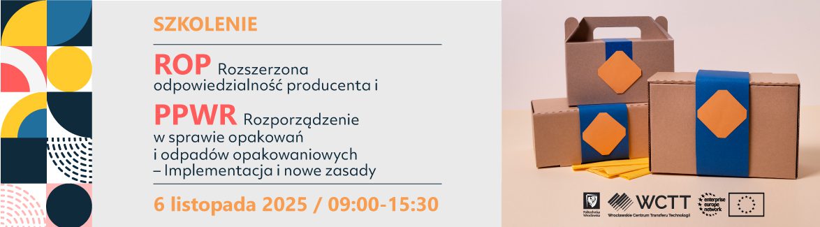Wrocławskie Centrum Transferu Technologii PWr zaprasza firmy z Dolnego Śląska i Województwa Opolskiego, na szkolenie pt. „ROP (Rozszerzona Odpowiedzialność Producenta) i PPWR (Rozporządzenie w sprawie opakowań i odpadów opakowaniowych – Implementacja i Nowe Zasady”.