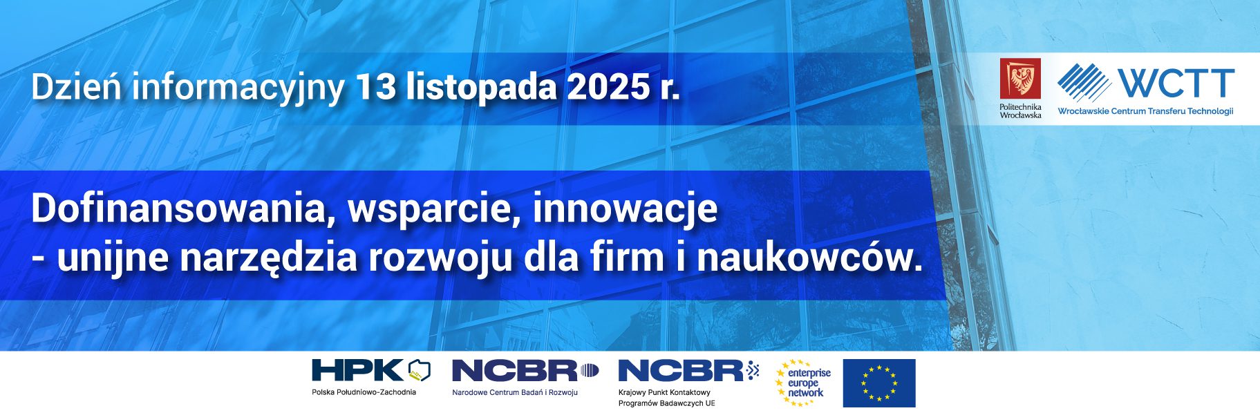 Serdecznie zapraszamy na Dzień informacyjny Wrocławskiego Centrum Transferu Technologii Politechniki Wrocławskiej, organizowany z Horyzontalnym Punktem Kontaktowym Polska Południowo-Zachodnia (HPK PPZ) oraz Enterprise Europe Network (EEN), przy udziale Głównego Punktu Informacyjnego Funduszy Europejskich (PIFE).