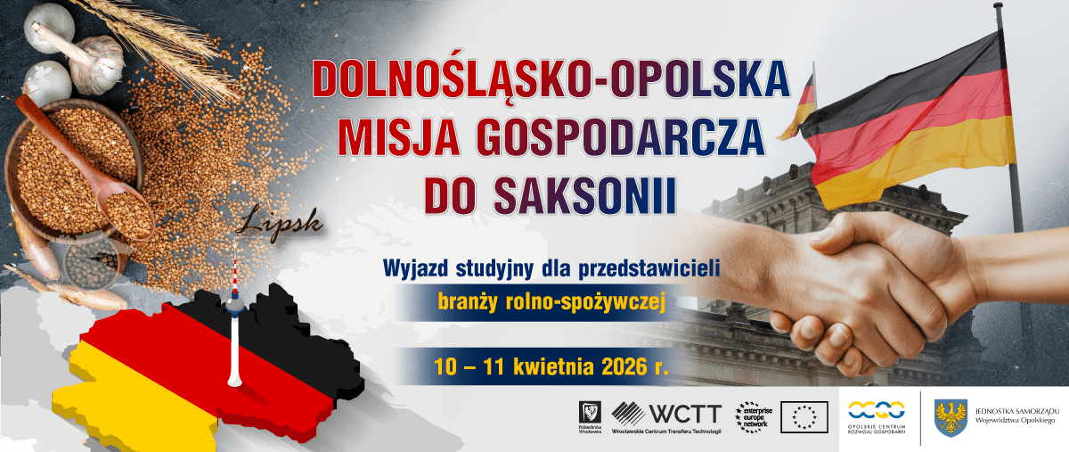 Wrocławskie Centrum Transferu Technologii Politechniki Wrocławskiej, działające w ramach europejskiej sieci Enterprise Europe Network, we współpracy z Opolskim Centrum Rozwoju Gospodarki, zaprasza firmy z branży rolno-spożywczej z województwa dolnośląskiego i opolskiego do udziału w dolnośląsko-opolskiej misji gospodarczej do Saksonii, która odbędzie się w dniach 10-11 kwietnia 2026 r.