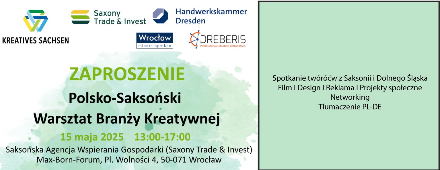 W imieniu naszego partnera – Saksońskiej Agencji Wspierania Gospodarki (Saxony Trade & Invest) – serdecznie zapraszamy do udziału w Polsko-Saksońskim Warsztacie Branży Kreatywnej, który odbędzie się we Wrocławiu w dniu 15 maja 2025 r. o godz. 13:00.